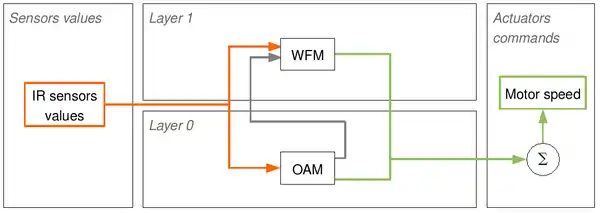 - OAM: It's the only reflex module. If the OAM detects an obstacle, it must inhibit the LFM in order to avoid its influence. The OAM has also to inform the WFM where is wall.