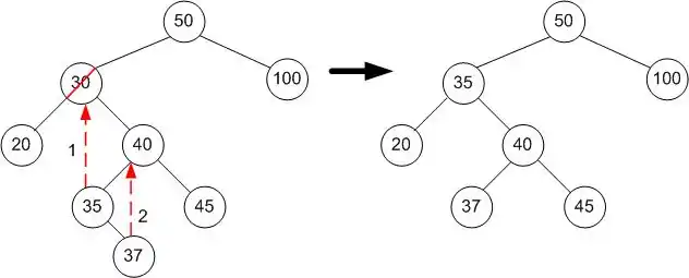 - replace the successor (35) with it's right subtree (37). There is no left subtree because the successor is leftmost.