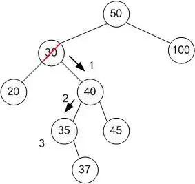 - 35 replaces 30, at the original right node, and the node with 35 is deleted, replacing it with the right sub-tree, which has the root node 37.