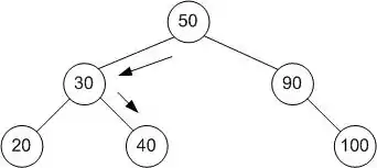 - 50's left child is 30, which is less than 40, so you next go to 30's right child.