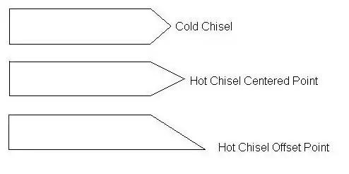 A hot cut chisel is ground or forged to thirty degrees instead of the sixty degrees a common cold chisel is. The point may be centered in the chisel or offset to one side.