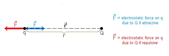 Any force on an object is a vector quantity.  Vector quantities such as forces are characterized by a numerical magnitude (i. e. basically the size of the force) and a direction.  A vector is often pictured by an arrow pointing in the direction.  In a force vector, the direction is the one in which the force pulls the object.  The symbol  is used here for the electric force vector.  If charges q and Q are either both positive or both negative, then they will repel each other.  This means the direction of the electric force  on q due to Q is away from Q in exactly the opposite direction, as shown by the red arrow in the preceding diagram.  If one of the charges is positive and the other negative, then they will attract each other.   This means that the direction of  on q due to Q is exactly in the direction towards Q, as shown by the blue arrow in the preceding diagram.  The Coulomb's equation shown above will give a magnitude for a repulsive force away from the Q charge.  A property of a vector is that if its magnitude is negative, the vector will be equal to a vector with an equivalent but positive magnitude and exactly the opposite direction.  So, if the magnitude given by the above equation is negative due to opposite charges, the direction of the resulting force will be directly opposite of away from Q, meaning the force will be towards Q, an attractive force.  In other sources, different variations of Coulombs' Law are given, including vector formulas in some cases (see Wikipedia link and reference(s) below).