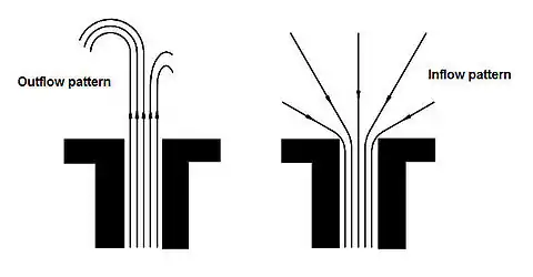 - Jet driven streaming: Periodic suction and ejection of a viscous fluid through an orifice or a change in cross section. The mechanism relies on the fact that a viscous fluid behaves quite differently during the suction and ejection periods. During the suction period the flow comes from all kind of directions, whilst during the ejection period a jet is produced. In Figure 2, the outflow and inflow patterns at the transition between a small tube and open space are shown. These two outflows can be regarded as the superposition of a broadly distributed oscillating flow and a time-averaged toroidal circulation. Figure 2: Outflow and inflow patterns Figure 2: Outflow and inflow patterns