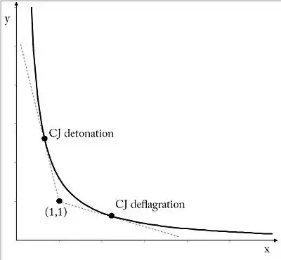 Note that the case where q=0 corresponds to a non reacting shock wave and the Hugoniot curve will pass by the point (1,1) in the x-y plane. When the Rayleigh line is tangent to the Hugoniot curve, the tangent points are called Chapman-Jouquet (CJ) points. The upper CJ point corresponds to the CJ detonation solution whereas the lower CJ point is referred as the CJ deflagration solution.