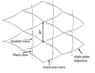A sketch of a simplified cellular detonation structure is shown below. λ represents the cell size.