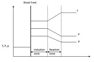 Assuming a one dimensional steady flow, the Zel’dovich, von Neumann and Döring (ZND) model is an idealized representation of the detonation wave. The model essentially describes the detonation wave as a leading shock followed by chemical reactions. The leading shock adiabatically compresses the reactants, increasing the temperature, pressure and density across the shock. An induction zone is followed where the reactants are dissociated into radicals and free radicals are generated. The induction zone is thermally neutral in the sense that the thermodynamic properties remain relatively constant. When enough active free radicals are produced, a cascade of reactions occurs to convert the reactants into products. Chemical energy is released resulting in a rise in temperature and a drop in pressure and density. The decrease in pressure in the reaction zone is further decreased by expansion waves and creates a forward thrust that will support the leading shock front. In other words, the proposed propagation mechanism of a detonation wave is autoignition by the leading shock which is supported by the thrust provided by the expansion of the products.