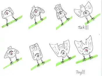 The male manakin modifies the sixth and seventh secondary feathers, which act as a pair of coupled resonators. The five other secondary feathers oscillate in phase with them to result in sonation, which sounds like a ringing Tick-Tick-Ting [1]. The series of motions involves two brief mechanical ticks, when the wings are flicked and a sustained mechanical ting, when they are flipped above the back [2]. These two sounds are not acoustically different except for the longer duration of the ting. Each of them is composed of a fundamental frequency of 1.49 kHz and its higher frequency harmonics.