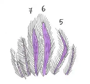 Unlike typical secondaries, secondary feathers 1–5 exhibit increasingly wider rachi and an increasingly pronounced transition from continuously tapering to an abrupt taper around the distal two-third, three-fourth and then four-fifth for the third, fourth and fifth secondaries, respectively. Beyond the sudden taper on the fifth secondary, the rachi bend medially. This ‘kink’ in the rachis causes it to overlap and contact the rachis of the adjacent sixth secondary feather, while at rest[3]. The sixth and seventh secondaries exhibit the following distinct modification: the rachi is thick at the base, and at approximately one-half of its length, their width doubles and they twist along their long axis so that the dorsal feather surface is oriented medially. The sixth secondary feather has ridges, while the fifth feather has a curved tip [4]. The innermost pair of the modified feathers (seventh secondaries) collide across the back. Immediately following this collision, the wings shiver laterally and medially, pulling them just millimeters apart. Approximately 8ms later, they are adducted to produce another collision. The sonation tone is produced continuously throughout this process and the feathers generate vibrations at just the right frequency [3].