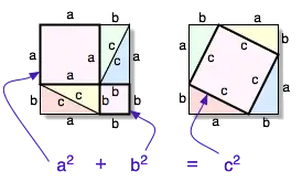 The proof is very simple, as one sees from the graphic one constructs first a square formed by four triangles and by two squares, one of side a and the second of side b. The area of a square is calculated multiplying the side by itself or in modern notation the area is the side raised to the power two. The area of the large square is therefore the sum of the areas of the squares values a2 and b2 plus the sum of the four triangles. In the second square we have again four triangles and a square of area c2. The four triangles being present both to the left of the equality and to the right can be eliminated. Therefore remaining in the equation: