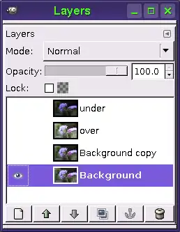 My images aren't perfectly aligned. Not sure why, maybe it has something to do with my tripod being on soft ground. Show only the underexposed and regular layer, and set the underexposed layer to partial transparency. Then zoom to 800% and move the underexposed layer until it is aligned with the regular exposure. Tap the arrow keys to move the layer one pixel at a time. You can try temporarily setting the mode of the dark layer to Divide or Difference; this will give strong contrast at unaligned edges (a high opacity will make the effect stronger). Repeat on the overexposed layer.