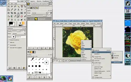 After editing all the layers (remember to perform the inverse FFT on all of them!), you must mix them to get your RGB picture back. Right-click on the picture and choose "Image > Mode > Compose" (see screen-shot on right). Here is your picture!