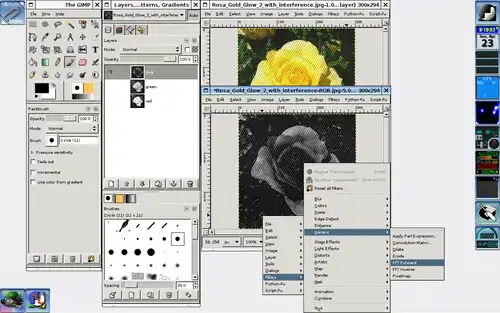 - the Fourier Gimp plug-in, you can get it from http://people.via.ecp.fr/~remi/soft/gimp/gimp_plugin_en.php3. There is no package for Debian/Ubuntu, you have to install it from the source.