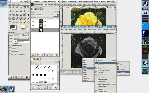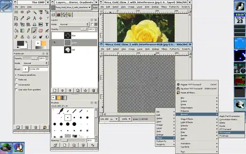 Select the window with the new picture, go to the layers window (if you can't see it, go to "File > Dialogs > Layers" and it will appear) and hide all but one layer, by clicking on the eyes. Then select the remaining layer. In the screen-shot on the left, I have isolated the blue layer. Now you can work on one layer without influencing the others. Let us convert it to its spectrum using the FFT plug-in: right-click on the picture and go to "Filters > Generic > FFT Forward" (see again the screen-shot on left). Now you can manipulate the spectrum of the blue layer of the picture. Note: strictly speaking, the Fourier transform of a signal is made of amplitude and phase; Gimp will show you only the amplitude, and that is the only thing you can edit, but it is enough for our purpose.