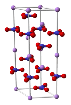 |  The ions arrange themselves into a lattice where each ion is surrounded by ions of the opposite type. |  An example of both atomic (Li+) and molecular (NO3-) ions |