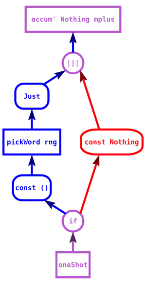 getWord example of the tutorial. Blue indicates a Left tag and red indicates Right. Note that the if construct of proc notation sends True to Left and False to Right. Corresponding code:proc () -> do