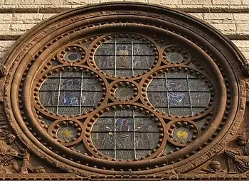 - (a) What is the exact radian measure in terms of π between two consecutive circular dots on the small circle in the center of the window?