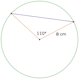 Example 5 Find the length of the chord of a circle with radius 8 cm and a central angle of 110°. Approximate your answer to the nearest mm. Solution: It's always a good problem solving technique to estimate the answer first. A thought process for estimating the measure might look something like this: The angle is slightly more than 90°, or radians. radians is slightly more than 1.5 radius lengths. One and a half radii would be 12, so we might expect the answer to be a little more than 12 cm. Let's see how the actual answer compares. We must first convert the angle measure to radians: Using the formula, half of the chord length should be the radius of the circle times the sine of half the angle. 8 · sin (Make sure your calculator is in radians!) Multiply this result by 2.