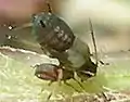 Another widespread aphid in the Phylloxeridae family is Daktulosphairia vitifoliae (still frequently called by its former name Phylloxera vitifoliae), the famous Phylloxera which causes enormous loss by attacking the leaves and roots of grape vines. Its life-history is similar to that of Aphis rosae described above. In the autumn a single fertile egg is laid by apterous females in a crevice of the bark of the vine where it is protected during the winter. From this egg in the spring emerges an apterous female who makes a gall in the new leaf and lays therein a large number of eggs. Some of the apterous young that are hatched from these form fresh galls and continue to multiply in the leaves, others descend to the root of the plant, becoming what are known as root-forms. These, like the parent form of spring, reproduce parthenogenetically, giving rise to generation after generation of egg-laying individuals. In the course of the summer, from some of these eggs are hatched females which acquire wings and lay eggs from which wingless males and females are born. From the union of the sexes comes the fertile egg from which the parent form of spring is hatched.