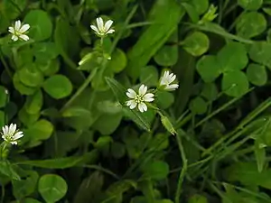 Cerastium vulgatum, one of several closely related species referred mouse-ear chickweed, is a low-growing winter annual native to Europe, but invasive in North America.