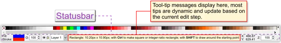 Command keys (Ctrl, Shift and Alt) based Tool-Tip messages can be read at the bottom center of the user interface in the Statusbar. The tool tips are dynamic and will change based on (1) current edit being performed (2) mouse-over 🖰 of one the shape handles (3) press and hold one of the three command keys (Ctrl, Shift and Alt) will update with the associated tool tip, i.e., while in the Rectangles and Squares tool hold the Ctrl key and the tool-tip message will update.