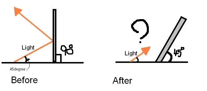 1. A beam of light is sitting in the floor 45 degree and it is shining to a mirror that was sitting at the floor 90 degree, if the mirror turn 45 degree where the light is pointing to and the light remain the same position, what will be the new reflection angle? (Hint: follow the wording use the diagram only as a guide)