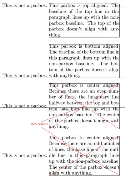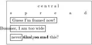 A box is the TeX term for an invisible container that can hold a visible element, nothing, or other boxes. Glue is the TeX term for an invisible connector that determines the relative position of joined boxes. Each separate visible element contained within a TeX document is contained within a box. A visible element can be a letter, image, geometric shape, etc. TeX builds pages by gluing boxes together according to the default TeX rules, default LaTeX rules, or document commands. In a typical document, letter boxes are glued to other letter boxes to form words, which are then elastically glued to other words to form sentences. Sentences are broken into lines and placed in paragraph boxes. Elastic glue is squeezed or stretched to fully justify lines within paragraph boxes. Paragraph boxes are glued to diagram boxes, and so on.