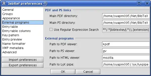 Third, we put all PDF files of publications in a specific subdirectory in our file server, where we use the BibTeX key as file name. We inform JabRef about this subdirectory by selecting Options → Preferences → External programs and adding the path of the this subdirectory in the field Main PDF directory (see figure 5). If a PDF file of a publication is available, the user can push the Auto button left of JabRef's Pdf field to automatically add the file name of the PDF file. Now, all users who have access to the file server can open the PDF file of a publication by simply clicking on JabRef's PDF icon.