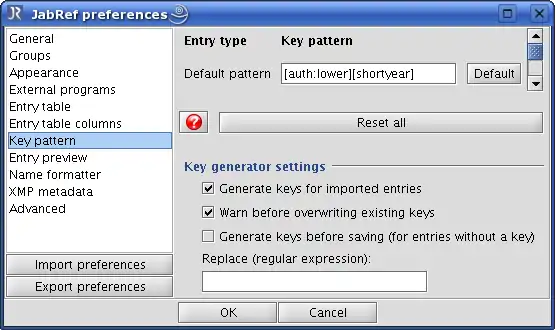 JabRef is highly flexible and can be configured in many details. We make the following changes to the default configuration of JabRef to simplify our work. First, we specify the default pattern for BibTeX keys so that JabRef can automatically generate keys in our desired format. This can be done by selecting Options → Preferences → Key pattern and modifying the desired pattern in the field Default pattern. For instance, we use [auth:lower][shortyear] to get the last name of the first author in lower case and the last two digits of the year of the publication (see figure 3).
