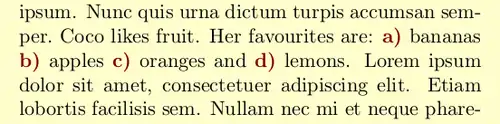 \begin{enumerate*}[label={\alph*)},font={\color{red!50!black}\bfseries}]