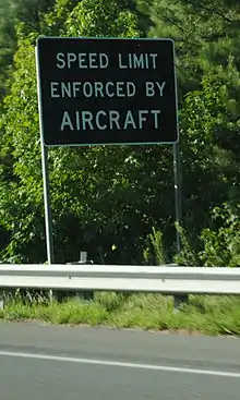 "Speed Limit Enforced By Aircraft" signs indicate to drivers that their speed could be monitored, but do not provide a means of verifying if an aircraft is present. Some states that used to employ aircraft to catch speeders left the signs up after stopping aerial surveillance. For instance, the signs remain standing in Virginia, despite a cease in traffic enforcement flights in 2012 "because of the cost associated with operating an aircraft."[18] Lt. Hansen of the Iowa State Patron explained that “we put the signs up because we want you to know and obey the speed limit,” even though flights do not occur every day.[19] In an amendment establishing the aircraft enforcement program, the Virginia General Assembly ordered that the signs should be not just "to inform motorists," but also to be "a deterrent to speeders on the Interstate System."[20]