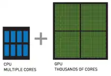 The CPU (central processing unit) has often been called the brains of the PC. But increasingly, that brain is being enhanced by another part of the PC – the GPU (graphics processing unit), which is its soul. Architecturally, the CPU is composed of a only few cores with lots of cache memory that can handle a few software threads at a time. In contrast, a GPU is composed of hundreds of cores that can handle thousands of threads simultaneously. The ability of a GPU with 100+ cores to process thousands of threads can accelerate some software by 100x over a CPU alone. GPU achieves this acceleration while being more powerful and cost-efficient than a CPU.