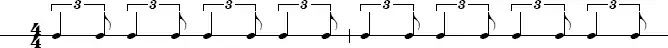 In the swing style, however, 8th notes are often played as though one subdivides the quarter note as an eighth note triplet and plays a quarter note-eighth note combination. This is a rather technical way to describe it, and indeed people originally thought that it was music solely of feeling that could not be written down. The first person to write down jazz successfully was Jelly Roll Morton. Swing rhythm might be notated as below: