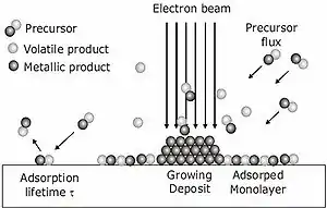 The cross-sections for electron beam induced ionization and dissociation of the precursor gas to form the deposits are generally not known. Cross-sections are usually of the order Ų and peak at low energies, corresponding the low energy of the secondary electrons which are probably the main cause of the deposition.