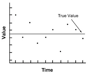Measurements and calculations can be characterized with regard to their accuracy and precision. Accuracy refers to how closely a value agrees with the true value. Precision refers to how closely values agree with each other. The following figures illustrate the difference between accuracy and precision. In the first figure, the given values (black dots) are more accurate; whereas in the second figure, the given values are more precise. The term error represents the imprecision and inaccuracy of a numerical computation.