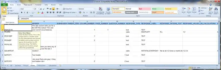 In the Items sheet of the OpenClinica spreadsheet, select cell B1 and then paste as values