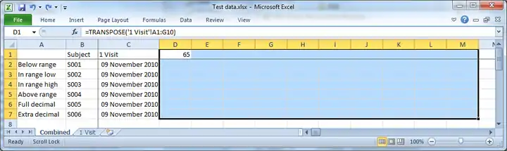 - Your formula should look like this: '=TRANSPOSE('1 Visit'!A1:G10)'