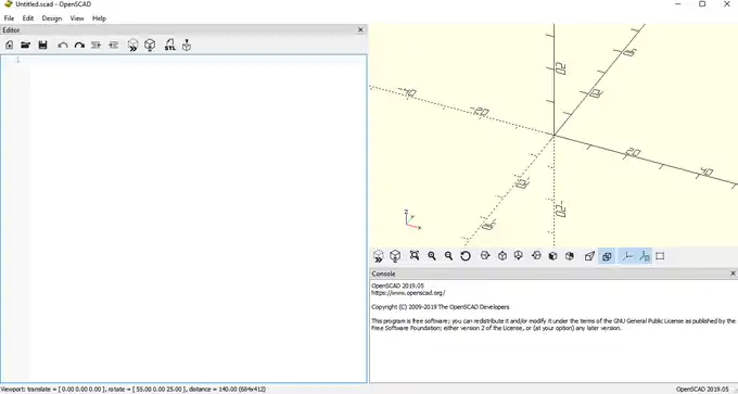 The first thing that you should notice is that the window of OpenSCAD is divided into two columns. The left column is a text editor, where you will be typing the OpenSCAD scripting language to create your models. Any model that you are ever going to create is going to be "typed out" in this text editor. The top of the right column is the "virtual" 3D space where your models will exist. The only thing that you should currently be able to find there is the annotated reference axes X, Y and Z. The bottom of the right column is the console, where OpenSCAD will be printing any error messages or other information as you build your models. One final thing that you should notice is the presence of one action bar over the text editor and one below the reference axes. You will be introduced to the available actions and you will use them as the tutorial moves on.
