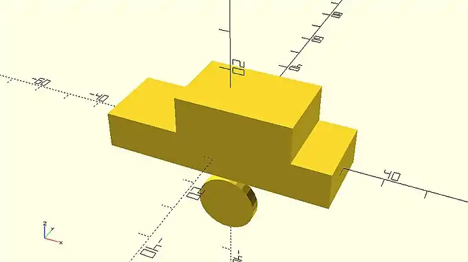 The model that you just created looks like the body of a car that has bad aerodynamics. That’s ok. You will be making the car look a lot more interesting and aerodynamic in the following chapters. For now, you are going to use the cylinder primitive and the rotate transformation to add wheels and axles to your car. You can create a wheel by adding a third statement that consists of the cylinder command. You will need to define two input parameters, h and r. The first one will be the height of the cylinder while the second one will be its radius.