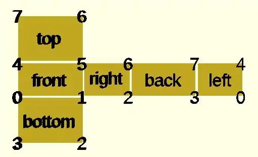 CubeFaces = [ /* [0,1,2,3], // bottom [4,5,1,0], // front */ [7,6,5,4], // top /* [5,6,2,1], // right [6,7,3,2], // back */ [7,4,0,3]]; // left