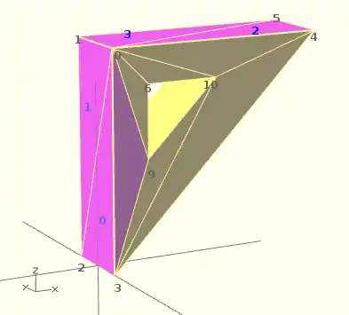 OpenSCAD allows, temporarily, commenting out part of the face descriptions so that only the remaining faces are displayed. Use // to comment out the rest of the line. Use /* and */ to start and end a comment block. This can be part of a line or extend over several lines. Viewing only part of the faces can be helpful in determining the right points for an individual face. Note that a solid is not shown, only the faces. If using F12, all faces have one pink side. Commenting some faces helps also to show any internal face.