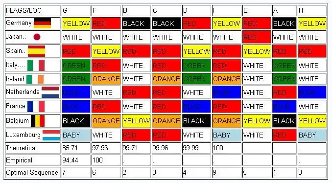 The results of optimization are shown above and include a listing of the theoretical and empirical percentages. The original characteristic sequence is indexed in the bottom row. Starting with area "G" the query begins by asking for the color in this area of the flag. Suppose we have in our possession the flag of Ireland. The answer to this first query would be GREEN. The next query is for the color in area "F" to which we would answer ORANGE. Since no other flags have this combination of GREEN and ORANGE in these areas our query can end here. The method has minimized the number of necessary queries required to identify the flag by optimizing the order of characteristics. (Please note that there may be more than one minimal solution.)