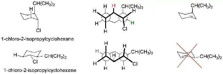 Note: Often the word periplanar is used instead of coplanar. Coplanar implies precisely 180 degree separation and "peri-", from Greek for "near", implies near 180 degrees. Periplanar may actually be more accurate. In the case of the 1-chloro-3-isopropylcyclohexane example, because of molecular forces, the chlorine atom is actually slightly less than 180 degrees from both the hydrogen and the isopropyl group, so in this case, periplanar might be a more correct term.