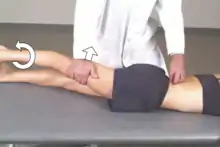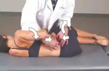 | Cruciate Ligament Sprain: The patient is supine. The physician places one pal over the anterior distal femur and the other pal over the tibial tuberosity. The physician adds a compressive force to approximate the femur and the tibia, followed by internal and external rotation to achieve a point of balanced tension. |  Cruciate Ligament Sprain BLT |