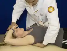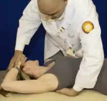 | Exhalation dysfunction key rib 2 (posterior scalene) | Patient is supine. Ask patient to place the dorsum of their dysfunction-side hand on their forehead, and then rotate their head away from the side of the key rib. Contact the key rib as close to the costotransverse junction as possible with one hand, and stabilize the patient’s head/hand with the other hand. Ask the patient to perform a forced maximal inhalation and simultaneously try to lift their head off the table. Resist their head motion, and during the inhalation phase apply a caudad force on the key rib at the costotransverse junction. |  Rib 2 exhalation dysfunction |