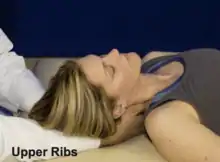 | Inhalation dysfunction key ribs 1-10 (respiratory diaphragm) | Patient is supine. Physician sits/stands either at the head of the table or to the side of the table. Contact the lateral portion of the key rib with firm pressure, using as broad contact as possible. Be sure to avoid any sensitive areas (i.e. breast tissue). Apply a caudad force on the key rib, exerting just enough pressure to feel tension over the dysfunctional ribs. Supporting the patient’s head and upper body, sidebend the patient to the same side as the key rib, using the key rib as a fulcrum. Ask the patient to perform a cycle of forced maximal inhalation and exhalation. During the exhalation phase, increase caudad pressure on the key rib and sidebending around the key rib. |  Upper ribs inhalation dysfunction  Lower ribs inhalation dysfunction |
