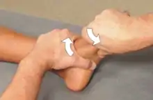 - Plantarflexion is accompanied by adduction and supination of the foot. This motion also carries the lateral malleolus anteriorly. Through the reciprocal action of the fibula, the proximal fibular head also glides posteriorly and inferiorly. The talus glides anteriorly placing the narrow portion of the talus in the ankle mortis, which is a relatively less stable position (compared to dorsiflexion, see below).