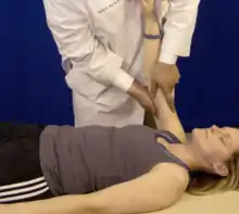 | Splenic pump | The patient lies supine and the patient's left hand is abducted to 90 degrees by the physician's right hand. The physician places the left hand over the left costal cartilages overlying the spleen. The left hand exerts pressure directly toward the center of the patient's body in a springing motion with the ribs moving inward. |  Splenic Pump |