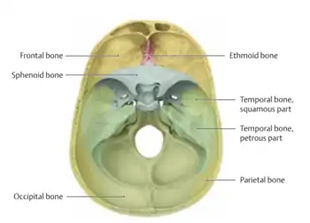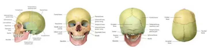 Anatomic landmarks in the skull which should be identified include the frontal bone, the parietal bone, the temporal bone (including the squamous portion, the petrous portion, and the tympanic portions), the sphenoid bone (including the greater wing and the lesser wing), the occipital bone, the zygomatic bone (or zygoma), the maxilla bone, the mandible bone, the ethmoid bone, the lacrimal bone, and the nasal bone.