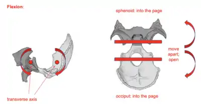Flexion Opposite rotation of the sphenoid and occiput about two transverse axes passing through sphenoid and occiput