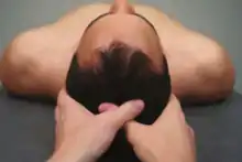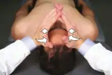 Compression of the fourth ventricle The patient is supine. The physician interlaces the fingers of both hands and cradles the occiput. The thenar eminences are placed posteromedially to the occipitomastoid sutures and encourages extension of the occiput while resisting flexion. The force is held until a sense of softening is felt.